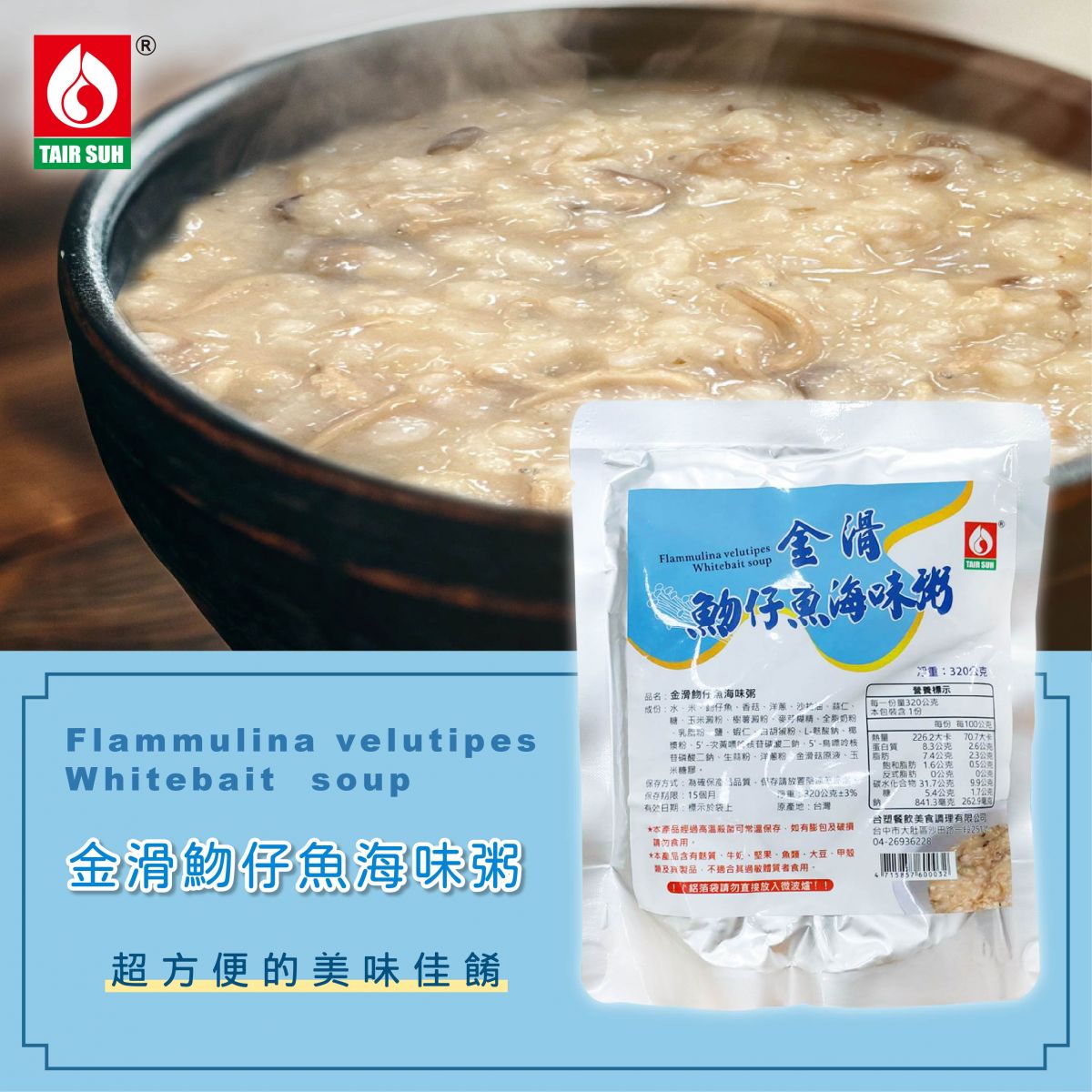 台塑餐飲美食調理有限公司推出金滑魩仔魚海味粥,內容物淨重:320g±3g