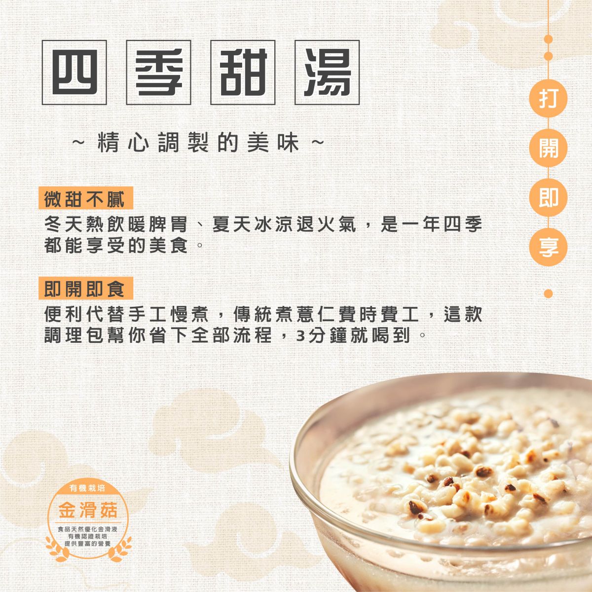 便利代替手工慢煮,傳統煮薏仁費時費工,這款調理包幫你省下全部流程,3分鐘就喝到。