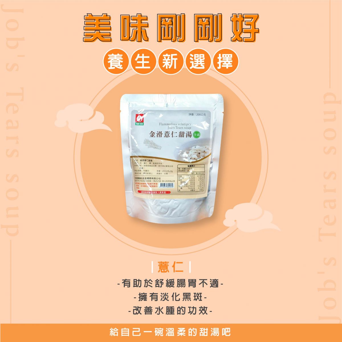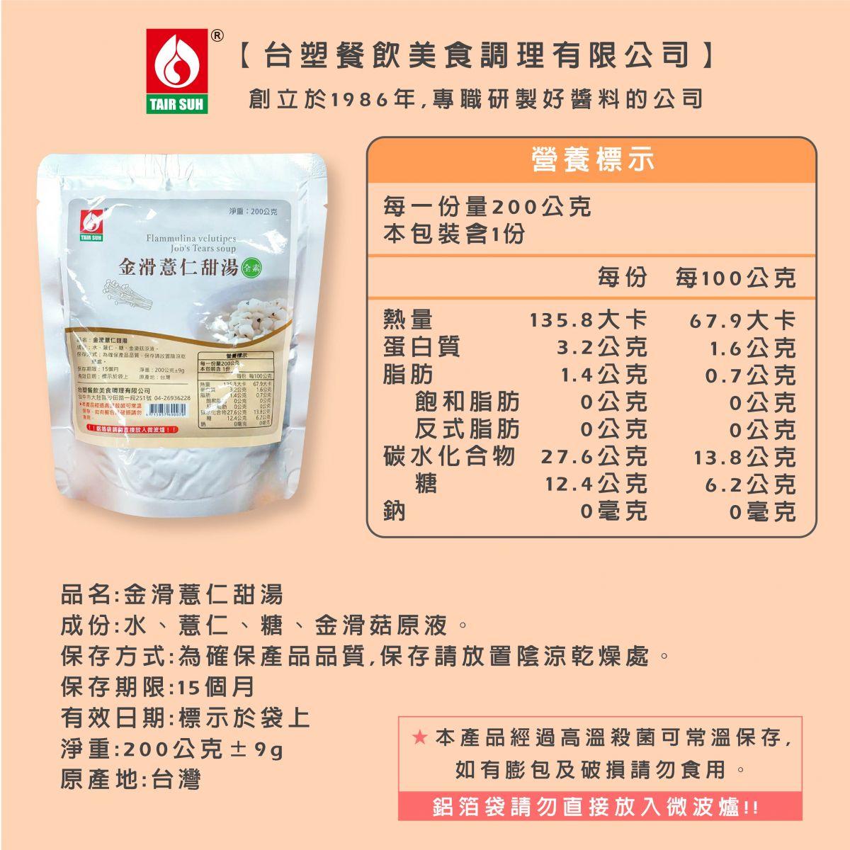 台塑餐飲美食調理有限公司推出 - (全素)金滑薏仁甜湯,內容物淨重:200g±9g