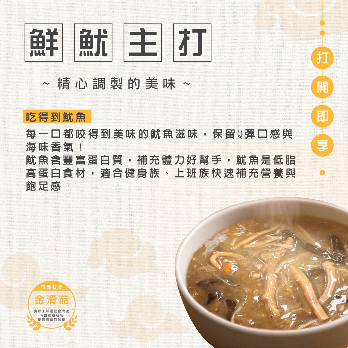 金滑鮮魷羹屬於"常溫商品"無需冷凍保存!拆開包裝加熱即可食用,省時又便利。